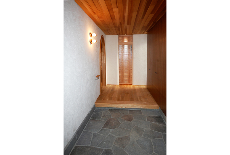 木造2階建て住宅。外観は、ガルバリウム鋼板と塗り壁による仕上げ。米杉、ナラのフローリング、天然石など、自然素材を活かした内装です。雪見障子を取り入れるなど和と洋をミックスしたデザインテイストに。
