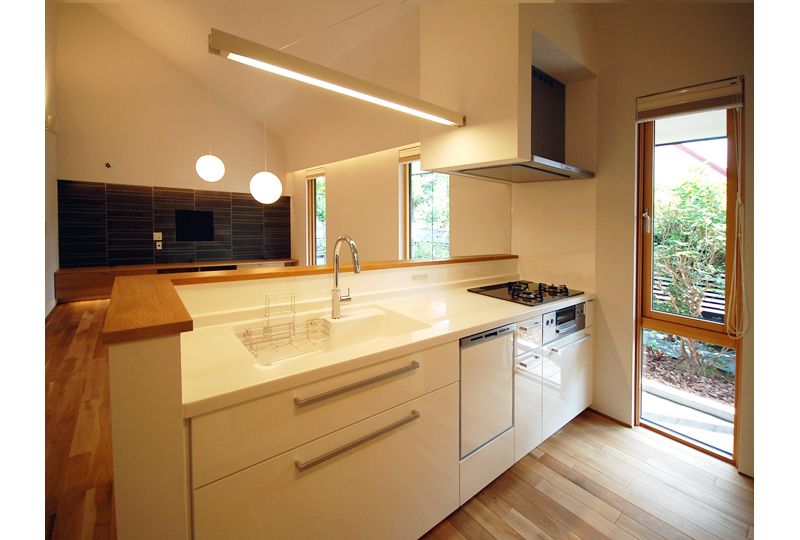 木造2階建て住宅。旧住宅を解体し建替えにより二世帯仕様に。それぞれに玄関を設け、1階(一部共有)と2階に世帯を分けました。引き戸や段差に配慮したバリアフリー設計。屋根はガルバリウム鋼板によるスノーストッパールーフ。