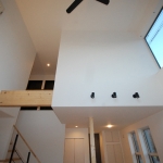 吹き抜けのあるリビングは、日差しが部屋中に拡散して明るくて開放的です。